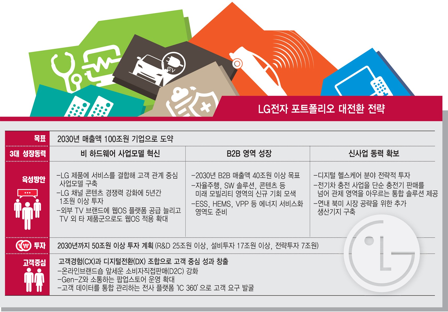 조 사장이 직접 발표한 미래 포트폴리오 청사진은 △비(非) 하드웨어 △기업간거래(B2B) △신사업 등 3대 축이다. 2030년까지 매출과 영업이익에서 3대 축 비중을 50% 이상 끌어올리는 게 목표다. 이를 위해 연구개발(R&D), 설비투자, 전략투자 등 50조원에 달하는 투자 계획도 밝혔다.