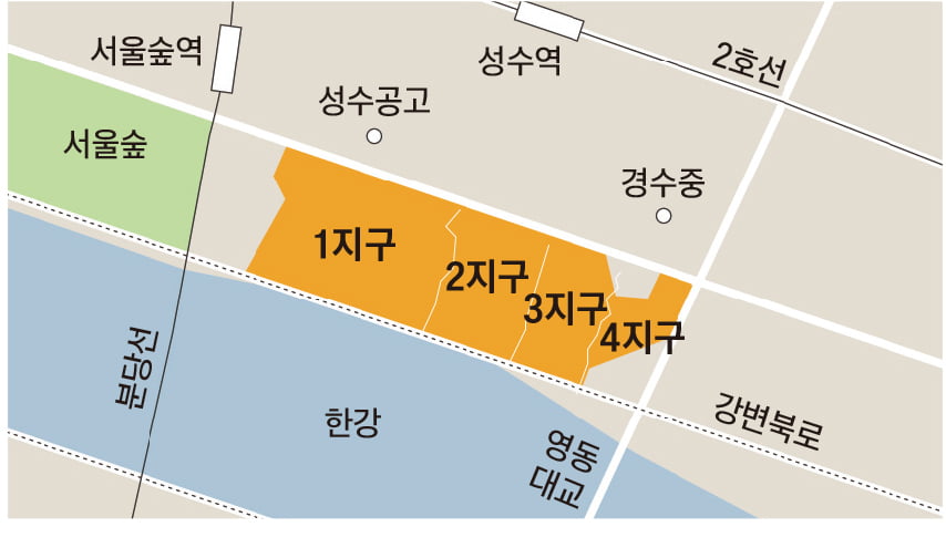성수전략정비구역 4개 지구 중 입지가 가장 좋은 곳은 1지구다. 서울숲과 지하철 수인분당선 서울숲역이 가장 가깝다. 트리마제 바로 옆이라 갤러리아포레·아크로서울포레스트 등과 거대한 블록을 만들 수 있다는 평가다. 면적도 4개 지구 중 가장 넓다.