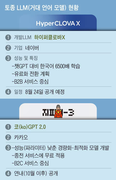 업계는 국내 양대 플랫폼이자 경쟁사인 네이버와 카카오의 LLM 비즈니스 모델 방향은 크게 다를 것으로 보고 있다. 네이버는 하이퍼클로바X를 공개한 뒤 일정 기간 시험 서비스를 거쳐 유료 전환을 검토할 계획이다. 반면 카카오는 가볍게 만든 LLM 모델을 기존 서비스에 붙이는 방식으로 무료 서비스한다는 방침이다.