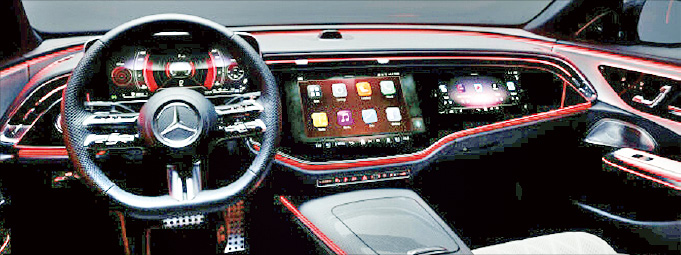 이번 E클래스는 7년 만에 풀체인지(완전변경)된 모델로 디자인이 크게 바뀌었다. 특히 앞좌석 대시보드 전체를 덮는 광활한 스크린이 특징이다. ‘MBUX 슈퍼 스크린’으로, 벤츠 내연기관 차량에 이렇게 큰 스크린이 적용된 건 처음이다.