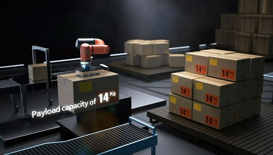 HCR-14는 길어진 로봇 팔과 높아진 가반하중을 기반으로 박스를 창고에 쌓고 내리는 팔렛타이징 작업 외에도 용접, 기계에 가공물을 넣고 빼내는 머신텐딩에 특화된 모델이라고 회사 측은 설명했다.