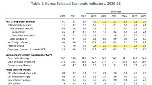 실제 IMF는 한국의 잠재성장률을 올해 2.1%, 내년과 2025년 2.2%, 2026~2028년 2.1%로 각각 추산했다.'잠재성장률'은 물가상승을 유발하지 않고 달성할 수 있는 최대 성장률이다.