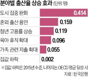 한은이 분석한 출산율 개선 효과는 △국내총생산(GDP) 대비 가족 관련 지출 증대 0.055명 △육아 휴직 확대 0.096명 △도시 집중 완화 0.414명 △혼외 출산 용인 0.159명 △청년 고용률 상승 0.119명 △집값 하락 0.002명이다.