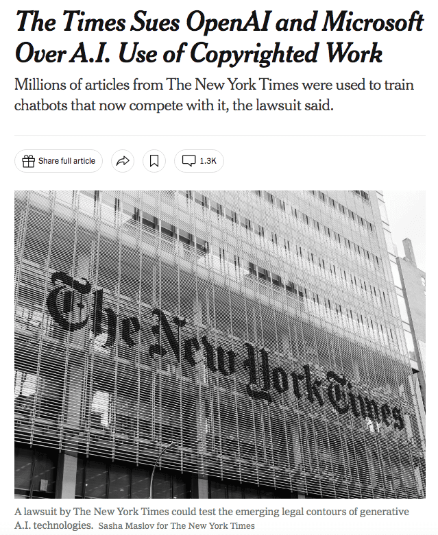 챗GPT를 비롯한 대용량 언어모델(LLM)이 저작권 침해 공방에 휘말린 것은 이번이 처음은 아니다. 하지만 뉴욕타임스와 오픈AI 간의 공방은 LLM 훈련 때 생길 수 있는 문제를 잘 건드리고 있다는 점에서 많은 관심을 끈다.