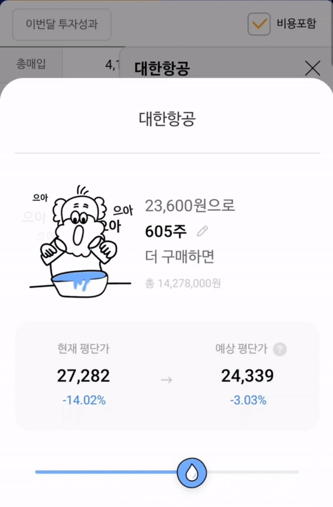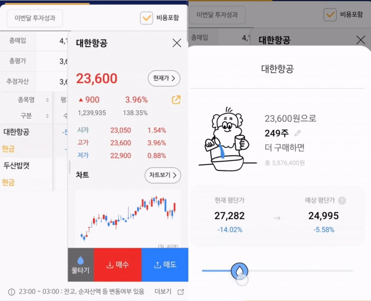 예컨대 대한항공 주식을 현재가 2만3600원으로 1000주 더 구매하면 현재 평단가 2만7282원에서 예상 평단가는 2만4085원으로 낮아지고 이를 위해선 2360만원의 투자자금이 든다는 것을 직관적으로 보여준다.물타기 기능은 나무증권이 최초는 아니다. 2022년 토스증권을 시작으로 신한투자증권 등이 물타기 계산기를 MTS에 적용해 사용 중이다.
