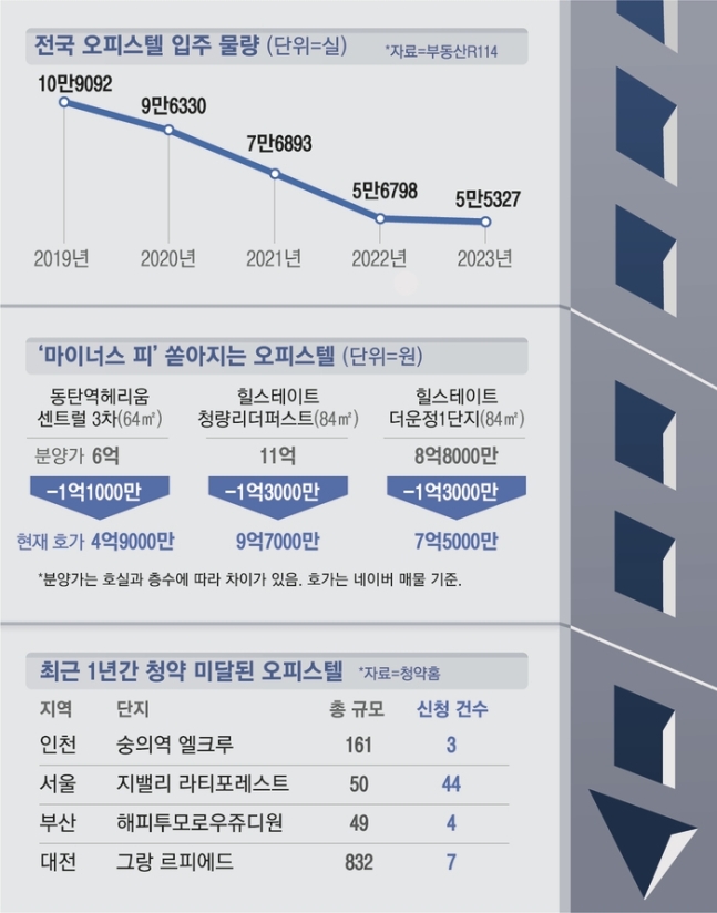 오피스텔 시장에 이미 불고 있던 찬바람이 더욱 거세지고 있다. 부동산 경기가 좋던 2020년 이후 분양에 나섰던 곳들이 실제 입주 시점이 도래한 가운데 분양자들이 잔금을 마련하지 못해 매물을 던지고 있다. 급한 분양자들은 ‘억’단위로 할인된 가격에 매물을 내놓지만 매수 수요가 없어 매물이 쌓이는 중이다. 침체된 시장 영향에 신규 오피스텔 청약도 미달이 속출하고 있다. 청약홈에 등록된 지난 1년간 청약을 개시한 전국 오피스텔 23곳(중복 단지제외) 중 절반 이상(12곳)이 미달이었다.