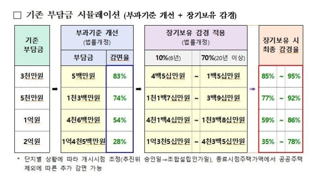20년간 주택을 장기 보유한 1세대 1주택자가 추가로 장기보유 감면까지 받으면 부담금은 840만원까지 줄어든다. 주택을 6년 보유한 1세대 1주택자는 부담금이 2520만원으로 감소한다.