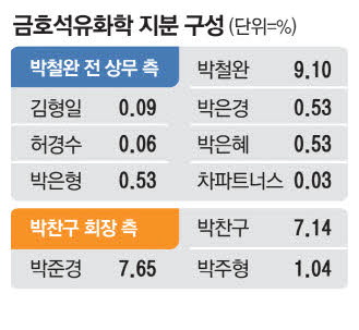 박 전 상무와 차파트너스는 15일 금호석유화학의 공동 보유자로서 특별관계가 형성됐다고 공시했다. 박 전 상무는 금호석유화학의 개인 최대주주로서 기업 거버넌스 개선, 소액주주 권리 보장, 경영진 감시·견제를 위해 필요한 권한을 차파트너스에 위임하기로 했다. 박 전 상무는 현재 금호석유화학 지분 9.10%를 보유 중이며 차파트너스는 지분 0.03%를 확보하고 있다. 박 전 상무와 차파트너스를 포함해 특별관계자가 보유한 지분은 총 10.88%에 달한다.