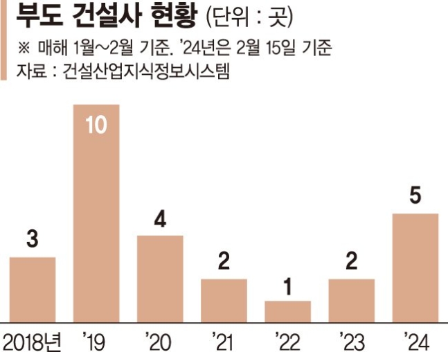 15일 업계와 건설산업지식정보시스템에 따르면 올 들어 이날까지 금융결제원 당좌거래 정지 기준으로 부도난 건설업체는 1월 3곳, 2월 2곳 등 총 5곳으로 집계됐다. 지난해 같은 기간 2곳 대비 2배 이상 증가한 규모로 2019년(10곳) 이후 최고치다. 부도업체는 지역별로 광주 1곳, 울산 1곳, 경북 1곳, 경남 1곳, 제주 1곳 등 모두 지방의 전문건설사다.