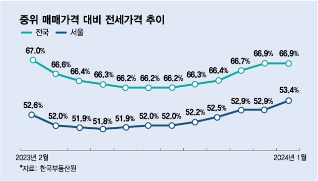 매매가와 전세가의 차이는 좁혀졌다. 전국 아파트 중위 매매가격 대비 전셋값은 지난달 기준 66.9%로 지난해 2월(67%) 이후 최대치를 기록했다. 서울은 53.5%로 절반 수준이지만, 자치구별로는 중랑구(60.5%), 강북구(60.3%) 등에서 전세가가 매매가의 60% 수준에 달했다.