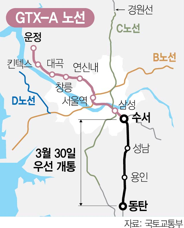 수도권 광역급행철도(GTX)-A 노선이 정부 계획대로 다음달 개통한다. GTX-B 노선은 올 상반기 내 착공된다. GTX D·E·F 노선 신설 작업도 이달 내 본격화한다.