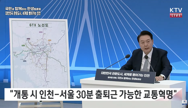 계획된 총 6개의 GTX 노선(A~E) 가운데 B, D, E 노선 등 3개가 인천에서 출발한다. B 노선의 경우 개통만 되면 인천시청에서 여의도까지 18분, 서울역까지 24분에 이동할 수 있다. 이를 두고 윤 대통령은 "서울과 인천 도심까지 30분 출·퇴근이 가능한 교통이 혁명이 시작된 것"이라고 했다.