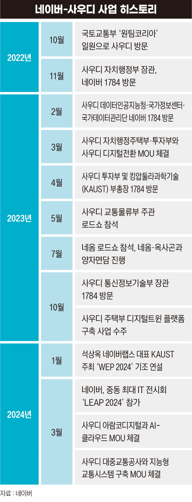네이버가 중동을 공략하기 시작한 것은 오래되지 않았다. 2022년 11월 중동 진출을 모색했고, 1년 만에 사우디아라비아에서 사업을 수주했다.