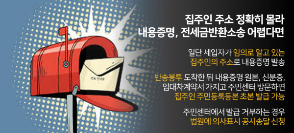 먼저 세입자가 내용증명을 보낼 때 집주인 주소를 꼭 알아야 하는 이유가 뭘까. 내용증명은 상대방이 문서를 받아야 효력이 생기는데, 집주인 주소를 모르거나 알고 있었던 주소지와 실제 주소지가 달라 문서가 도달하지 않으면 소용이 없기 때문이다. 전세금 반환 소송을 제기할 때도 마찬가지로 집주인 주소가 필요하다. 세입자가 전세금 반환을 요구하거나 소송을 제기하기 위해서는 먼저 전세계약을 해지해야 하는데, 집주인에게 의사가 전달되지 않으면 계약해지권에 문제가 생기고 자연스럽게 전세금 반환 소송도 지연될 수밖에 없는 구조다.