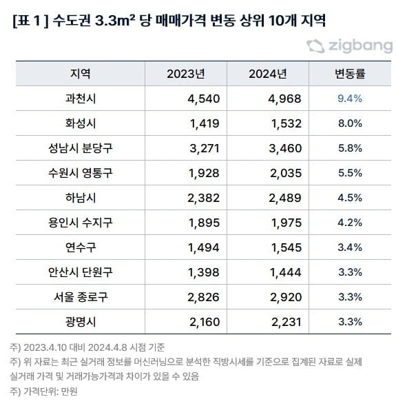 직방이 1년간 지역별 3.3㎡당 아파트 매매가격 변동률을 살펴본 결과, 과천시 아파트 가격이 2024년 4월 현재 3.3㎡당 4968만원으로 지난 해 4월보다 9.4% 상승했다고 15일 밝혔다. 수도권 자치구 내에선 변동률이 가장 높았다.