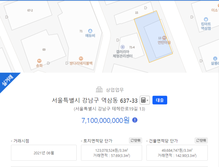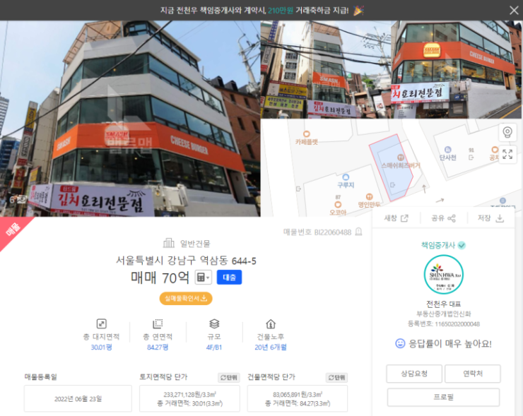 아래 2개의 건물은 매물로 나온 가격(2022년 6월 30일 기준) 실제 거래된 가격 (2021년 6월)의 차이가 적고 둘다 지상 4층, 지하1층 규모의 건물입니다.