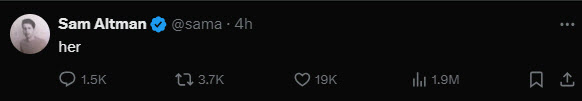 아울러 그는 “새로운 음성(및 비디오)보드는 제가 사용해 본 컴퓨터 인터페이스 중 최고”라며 “마치 영화에 나오는 AI처럼 느껴지는데, 이것이 현실이라는 사실이 아직도 조금 놀랍다. 사람 수준의 응답시간과 표현력을 갖추게 된 것이 가장 큰 변화”라고 추켜세웠다. 그는 이날 자신의 X계정에 영화 ‘허(Her)’의 제목을 적었다. GPT-4o가 사만다를 모델로 만들었다는 것을 암시할 수 있는 대목이다.