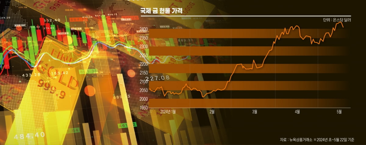 ‘위기 방파제’ 금이 먼저 빛났고 구리와 은 역시 신고점을 향해 달려갔다. 5월 20일 기준 금 현물 가격은 장중 2450달러를 돌파해 장중 사상 최고치를 경신했고 구리가격도 톤당 1만1000달러를 넘어섰다. 국제 금값은 소폭 하락해 지난 23일 2337.20달러에 마감했지만 올 들어 여전히 12.81%나 오른 가격이다.