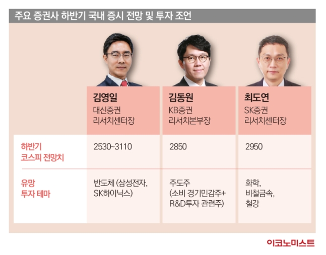 코스피 전망에 대한 온도차는 있었지만, 대부분의 증권사는 하반기 유망 테마(투자 주제)로 반도체와 조선·온디바이스 인공지능(AI)을 지목했다. 먼저 김영일 대신증권 리서치센터장은 올해 하반기 코스피가 최대 3110포인트까지 움직일 것으로 전망했다. 김 센터장은 “미국 경기만 독보적으로 강했던 지난해와 올해 상반기였지만 올 하반기 이후 미국 이외 지역, 특히 중국과 유럽 경기 회복이 가시화되고 미국 경기는 견고한 모멘텀을 보유하고 있지만 둔화가 예상된다”고 말했다. 이어 “이러한 경기 흐름 변화는 그동안 강했던 달러가 약해지면서 위험 자산 강세가 전망된다”며 “주식시장 측면에서 미국 이외 지역, 특히 그동안 부진했던 신흥국 증시가 상대적으로 강세 전개가 가능하고 통화정책도 금리 인상 중단 국면에서 금리 인하 사이클 시작·전개 국면으로 전환되고 있다”고 했다.