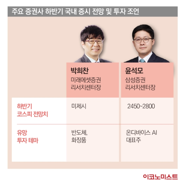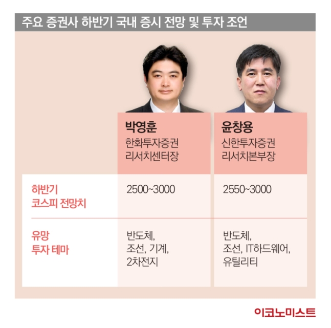 코스피 전망에 대한 온도차는 있었지만, 대부분의 증권사는 하반기 유망 테마(투자 주제)로 반도체와 조선·온디바이스 인공지능(AI)을 지목했다. 먼저 김영일 대신증권 리서치센터장은 올해 하반기 코스피가 최대 3110포인트까지 움직일 것으로 전망했다. 김 센터장은 “미국 경기만 독보적으로 강했던 지난해와 올해 상반기였지만 올 하반기 이후 미국 이외 지역, 특히 중국과 유럽 경기 회복이 가시화되고 미국 경기는 견고한 모멘텀을 보유하고 있지만 둔화가 예상된다”고 말했다. 이어 “이러한 경기 흐름 변화는 그동안 강했던 달러가 약해지면서 위험 자산 강세가 전망된다”며 “주식시장 측면에서 미국 이외 지역, 특히 그동안 부진했던 신흥국 증시가 상대적으로 강세 전개가 가능하고 통화정책도 금리 인상 중단 국면에서 금리 인하 사이클 시작·전개 국면으로 전환되고 있다”고 했다.