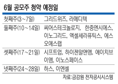 29일 금융감독원에 따르면 다음 달 공모주 일반 청약을 받는 기업은 기업인수목적회사(SPAC·스팩)를 제외한 13개사다. 이달 신규 상장주가 2개(아이씨티케이, 노브랜드)에 불과한 것과 비교하면 6배 이상으로 많다. 전력 기업 그리드위즈가 오는 6월 3~4일 일반 청약을 시작하는 가운데, △라메디텍 △씨어스테크놀로지 △한중엔시에스 △이노그리드 △엑셀세라퓨틱스 △에스오에스랩 △시프트업 △하이젠알앤엠 △에이치브이엠 △이노스페이스 △하스 △이앤셀 등이 일반 청약에 나설 예정이다. 특히 6월 둘째 주(10∼14일)는 씨어스테크놀로지·한중엔시에스·이노그리드·엑셀세라퓨틱스·에스오에스랩 등 5개 기업이 일제히 일반 청약을 진행하는 ‘공모주 슈퍼위크’가 될 전망이다. 스팩은 비상장기업 인수·합병(M&A)을 목적으로 하는 서류상 회사로 공모로 액면가에 신주를 발행해 투자자금을 모은 뒤 상장 3년 내에 비상장기업을 합병해야 한다.