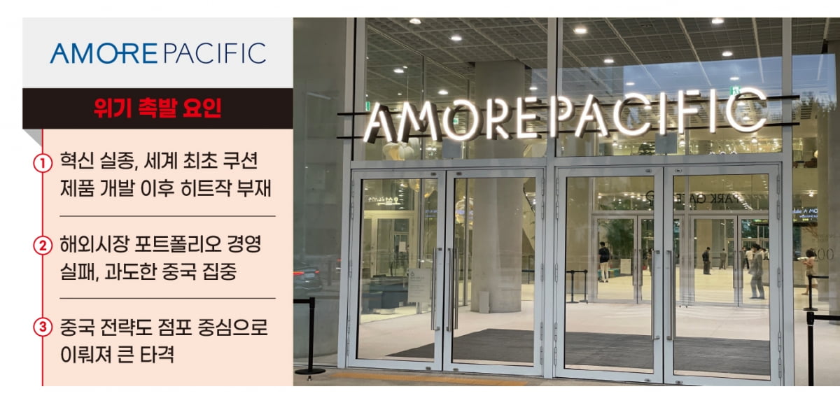 그러나 쿠션 이후에는 큰 혁신이 없었다. 한 업계 관계자는 “예전 아모레퍼시픽은 선망의 기업이었다”며 “트렌드를 선도하면서도 보너스도 두둑해 모두가 가고 싶어 했다. 한때는 ‘월급보다는 성과급 보고 취직하는 곳’이라는 말도 나왔다. 그런데 최근 들어서는 그 입지가 줄어들고 있다”고 말했다.중국 시장을 조기에 개척한 것이 성장의 발판이 됐지만 어느 시점에 이르자 성장을 짓누르는 반작용을 가져오기 시작했다. 서경배 회장은 일찌감치 중국의 성장 가능성을 알아봤다. 쿠션이 흥행한 이후 아모레퍼시픽은 중국에서 설화수 등 다양한 브랜드의 화장품을 엄청나게 판매했다. 한때 아모레퍼시픽의 해외 매출 가운데 중국이 차지하는 비중은 70%를 넘기도 했다. 하지만 중국의 사드(THAAD, 고고도미사일방어체계) 보복 등으로 큰 타격을 받았다. 중국 시장이 휘청거리자 그룹 전체가 큰 내상을 입을 수밖에 없는 구조였다.