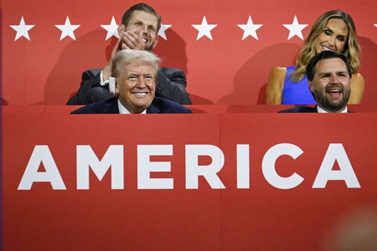 이후 그는 자신의 선거 슬로건인 'MAGA(미국을 다시 위대하게)'가 적힌 박스석으로 올라가 아들인 도널드 트럼프 주니어, 공화당 소속 의원들과 악수를 나누며 이동, 자신의 러닝메이트로 발표된 J.D 밴스 상원의원 옆에 자리를 잡았다. 트럼프 전 대통령이 걸음을 내딛는 내내 현장에는 기립박수와 환호가 이어졌다.