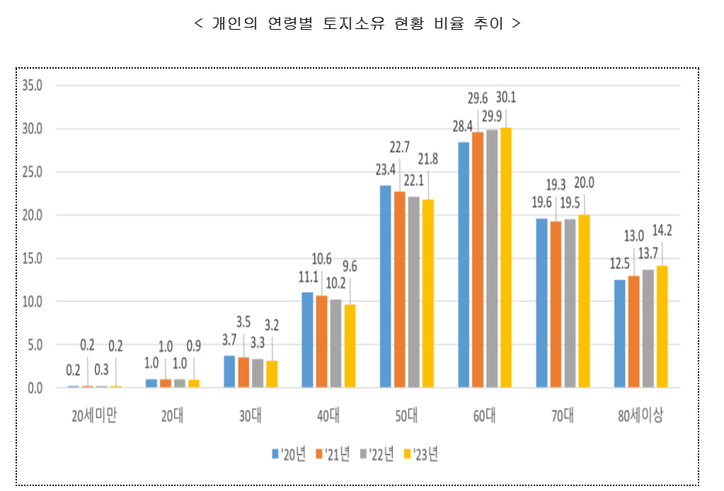 가구별로 보면 우리나라 전체 2391만가구 중 62.1%인 1486만가구가 토지를 소유하고 있었다.