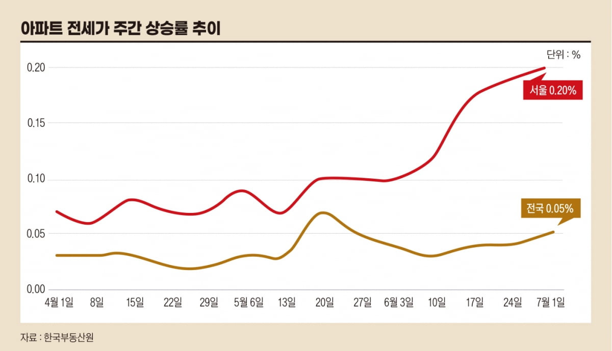 주택 시장이 꿈틀거리고 있다. 특히 100% 실수요라 할 수 있는 전세 시장이 서울을 중심으로 요동치고 있다. 한국부동산원에 따르면 7월 1일 서울 아파트 전세가 상승률은 전주 대비 0.2% 상승했다. 서울을 중심으로 전세 시장이 요동치고 있는 것이다. 그 원인은 무엇일까?