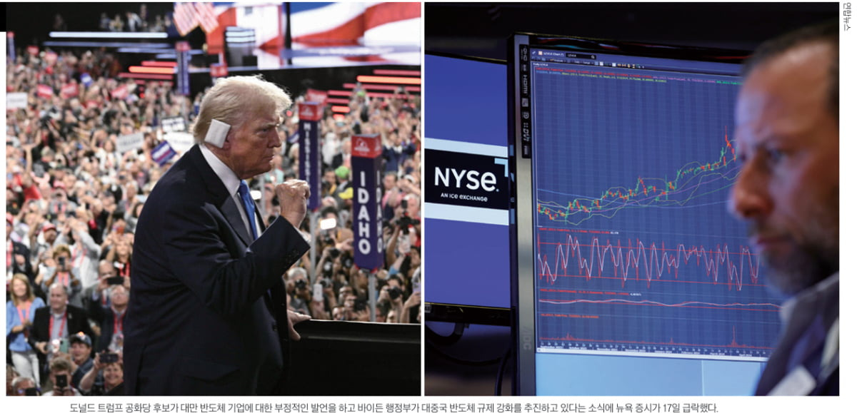 7월 17일에는 트럼프 대통령의 말 한마디에 반도체주가 일제히 추락했다. 트럼프 전 대통령은 블룸버그 비즈니스위크와의 인터뷰에서 대만이 미 반도체 사업의 100%를 가져갔다고 비판했다.