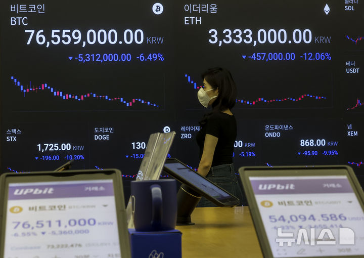 이날 오후 2시50분 기준 비트코인은 국내 가상자산 거래소 빗썸에서 24시간 전보다 10.99% 빠진 7486만원을 기록했다.
