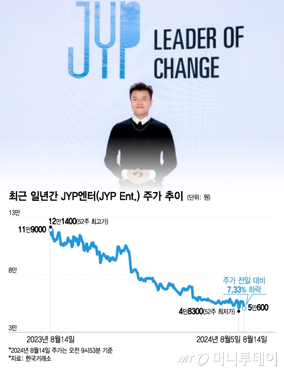 14일 오전 10시35분 기준으로 코스닥시장에서 JYP엔터는 전일 대비 4400원(8.06%) 내린 5만200원을 나타낸다. 장 초반 주가는 5만원까지 떨어지며 지난 4일 기록한 52주 최저가(4만8300원)에 다시금 다가섰다. 최근 일 년간 JYP엔터의 주가는 꾸준히 우하향하면서 57%대 빠졌다.