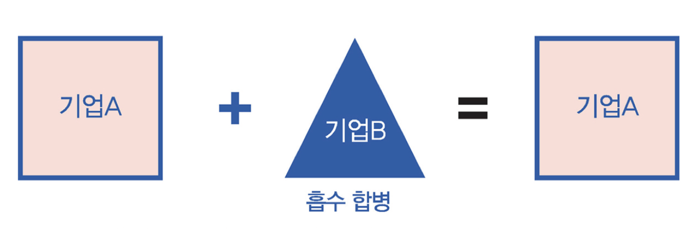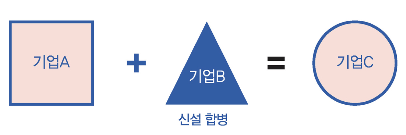 흡수 합병은 A+B=A, 신설 합병은 A+B=C인 구조이므로 B는 사라집니다. 상장기업의 경우 시너지 효과를 높이기 위해서 신설 합병보다 흡수 합병을 더 많이 이용합니다.