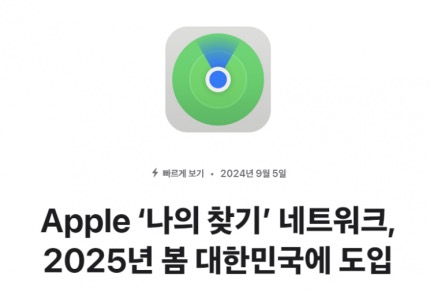 애플은 5일 자사 뉴스룸을 통해 "2025년 봄 나의 찾기 네트워크를 국내 도입한다"며 "한국 내 사용자들도 곧 나의 찾기 애플리케이션(앱)을 이용해 개인정보가 보호된 상태에서 자신의 애플 기기와 개인 소지품을 찾고, 친구 및 가족 등의 위치를 확인할 수 있게 된다"고 밝혔다.