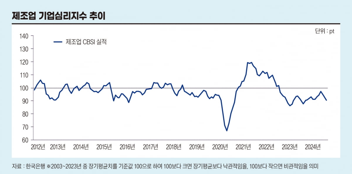 시장 심리가 좋은 것도 아니다. 미국의 금리인하로 훈풍이 불 것 같지만 아직은 싸늘하다. 기업심리지수는 주요국의 경기둔화 우려 등으로 석 달 연속 하락세다. 한국은행의 ‘9월 기업경기조사 결과’에 따르면 전산업 기업심리지수(CBSI)는 91.2로 전월보다 1.3포인트 하락했다. 이는 3개월 연속 하락세로 지난 3월(89.4) 이후 최저치다. 장기평균치(2003년 1월~2023년 12월)를 기준값 100으로 해 100보다 크면 장기평균보다 낙관적임을, 100보다 작으면 비관적임을 의미한다.
