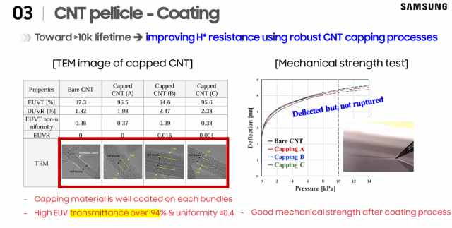 삼성은 CNT 펠리클이 대안이 될 수 있다고 주장했다. CNT 펠리클은 일종의 ‘직물(패브릭)’처럼 만들어졌다. 마치 헝겊처럼 작은 구멍들이 송송 뚫려 있기 때문에 빛은 통과시키면서 마스크에서 떨어진 이물질들은 그물망처럼 보호할 수 있다.