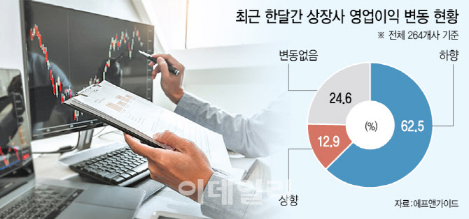 증권정보업체 에프앤가이드에 따르면 실적 전망치가 있는 상장사 264곳(잠정치를 발표한 상장사 제외) 중 62.5%에 이르는 165곳이 최근 한 달 사이 영업이익 전망치가 하향됐다. 34곳은 변화가 없었고 단 24.6%(65곳)만이 영업이익 전망치가 상향됐다.