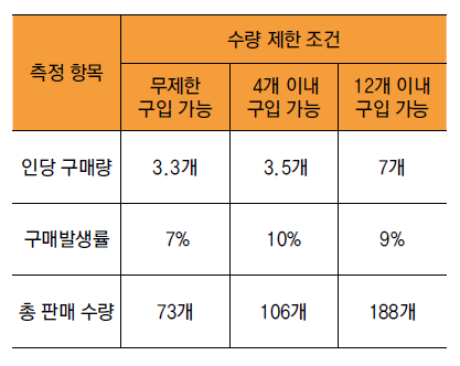 어떤 결과가 나왔을까? 구매량과 구매 발생률에서 의미 있는 차이가 나타났다. 구매 수량에 제한을 두지 않은 경우에는 쇼핑객들은 평균 3.3개를 구입했다. 반면에 구매 수량에 제한을 둔 조건 2에서는 평균 3.5개, 조건 3에서는 평균 7개로 구매량이 늘어났다. 구매 발생률도 수량을 제한할 때가 높게 나왔다.