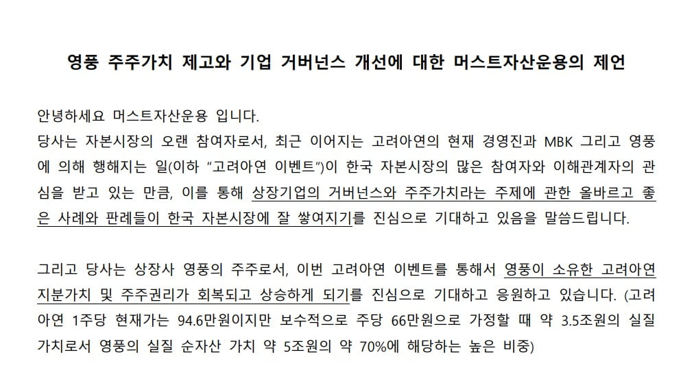 영풍은 사모펀드(PEF) 운용사 MBK파트너스와 연합해 현재 주주권익 및 거버넌스(의사결정과정) 개선을 촉구하며 최대지분을 가진 고려아연과 경영권 분쟁을 벌이고 있다.머스트운용은 "영풍은 시가총액 약 7110억원으로서 실질 순자산 가치 5조원의 약 0.14배에 거래되고 있고, 이는 시총 5000억원 이상의 상장사 중 무형자산이 커 예외적인 이마트(0.16배), 현대제철(0.15배)와 함께 제일 낮은 수치"라며 "영풍은 순자산의 품질이 매우 좋지만 한국 주식 시장에서 사실상 가장 싸게 거래되고 있다"고 지적했다.