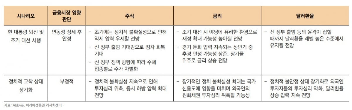 첫째는 현 대통령 퇴진 및 조기 대선 시행 시나리오다. 이 경우 금융시장에 단기적 변동성을 야기한 후 점차 안정될 것으로 예상된다.반면, 정치적 교착 상태가 장기화될 경우 금융시장에는 부정적인 영향이 지속될 전망이다.