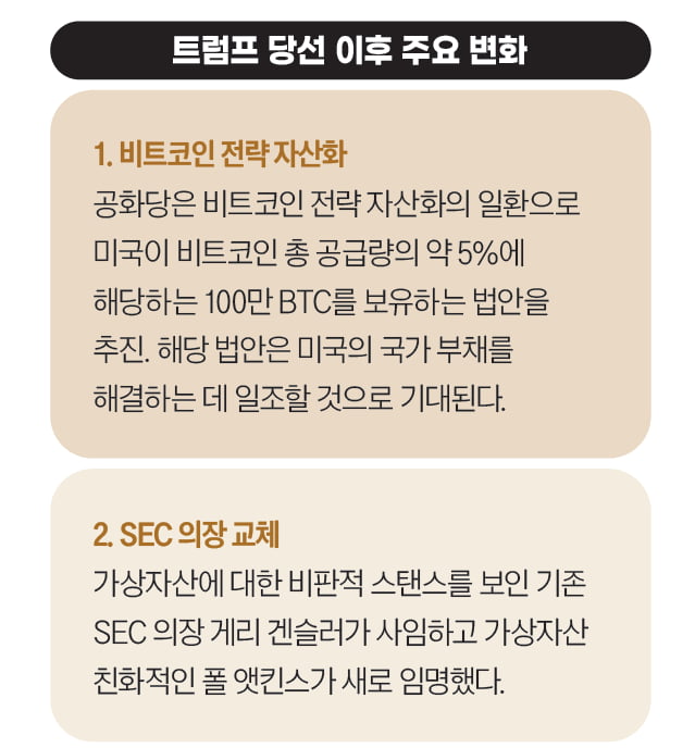 도널드 트럼프가 대통령으로 당선된 후 광폭 행보를 보이고 있다. 특히 가상자산 분야에서의 움직임이 돋보이는데 아래는 트럼프가 당선된 이후 주요 변화이다.