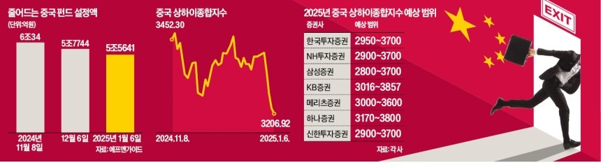 중국 증시에 투자하는 국내 펀드의 설정액이 3년 만에 최저 수준으로 떨어졌다. 중국 정부가 내놓고 있는 각종 경기 부양책에도 불구하고 부진이 이어지자 돈이 썰물처럼 빠져나가고 있다. 도널드 트럼프의 미국 대통령 취임이 임박하자 그동안 물려 있던 중국 증시에서 ‘손절’하는 투자자도 적지 않은 것으로 관측된다.