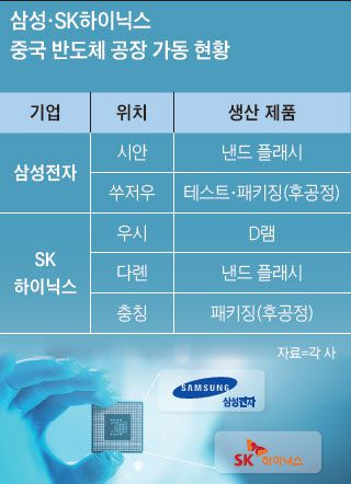 삼성전자는 중국 시안에 낸드 플래시 공장을 두고 있고, SK하이닉스는 다롄과 우시에 각각 낸드플래시와 D램 공장을 가동 중입니다.
