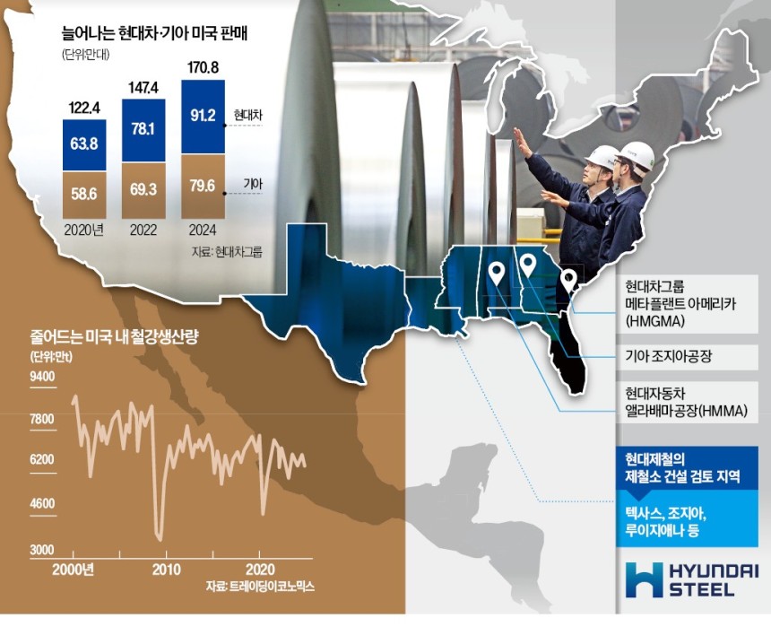 현대자동차그룹이 미국에 약 10조원을 투자해 철강산업 기지를 건설한다. 현대제철을 중심으로 제철소를 짓고 이곳에서 생산한 자동차용 강판 등을 인근 조지아주 현대차·기아 공장 등에 공급한다는 구상이다.
