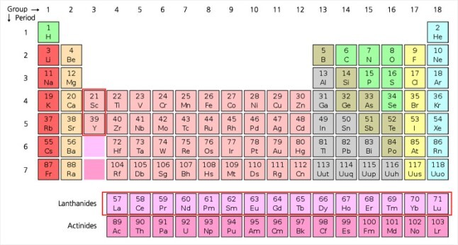 희토류 원소군은 원소 주기율표상 21번 스칸듐(Sc), 39번 이트륨(Y), 57번 란타넘(La), 58번 세륨(Ce), 59번 프라세오디뮴(Pr), 60번 네오디뮴(Nd), 61번 프로메튬(Pm), 62번 사마륨(Sm) 63번 유로퓸(Eu), 64번 가돌리늄(Gd), 65번 터븀(Tb), 66번 디스프로슘(Dy), 67번 홀뮴(Ho), 68번 에르븀(Er), 69번 툴륨(Tm), 70번 이테르븀(Yb), 71번 루테튬(Lu) 등 총 17개 원소입니다.