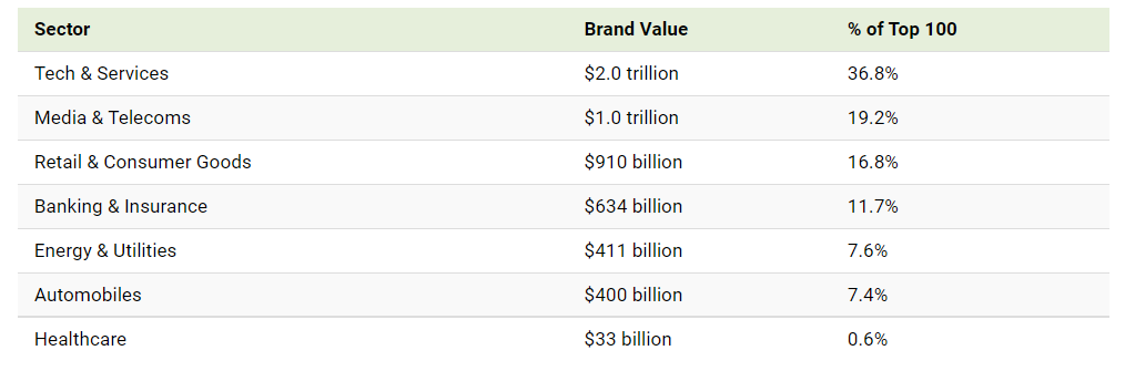 아래 카테고리 중 3분의 1 이상이 기술 및 서비스 부문에 속하며 브랜드 가치는 무려 2조 달러에 달합니다.