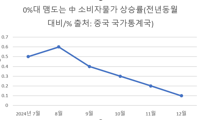 지난해 공식 경제성장률이 목표치인 5%를 달성했지만 중국 경제는 말 그대로 다중 악재에 시름하고 있다. 도널드 트럼프 미국 대통령의 대중 관세 인상 위협이 여전한 상황에서 지방정부의 부채난, 장기화한 부동산 시장 침체는 해결 기미를 보이지 않고 있다. 지난해 12월 소비자물가지수(CPI)는 전년 같은 기간에 비해 0.1% 올랐다. 중국 CPI는 올 들어 0%대 상승세를 면치 못하고 있다. 지난해 연간 CPI는 전년 대비 0.2% 상승해 목표치인 3.0%에 크게 못 미쳤다.
