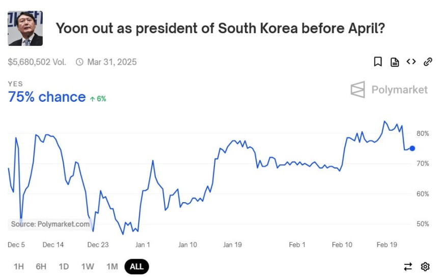 23일 세계 최대 베팅 사이트 '폴리마켓'에 따르면 오전 10시 25분 기준 '윤 대통령이 4월 전 대통령직에 있는지 여부'를 묻는 질문에 75% 확률로 탄핵이 인용될 것으로 전망했다. 총 베팅 금액도 568만502달러(한화 약 82억원)로 늘었다.