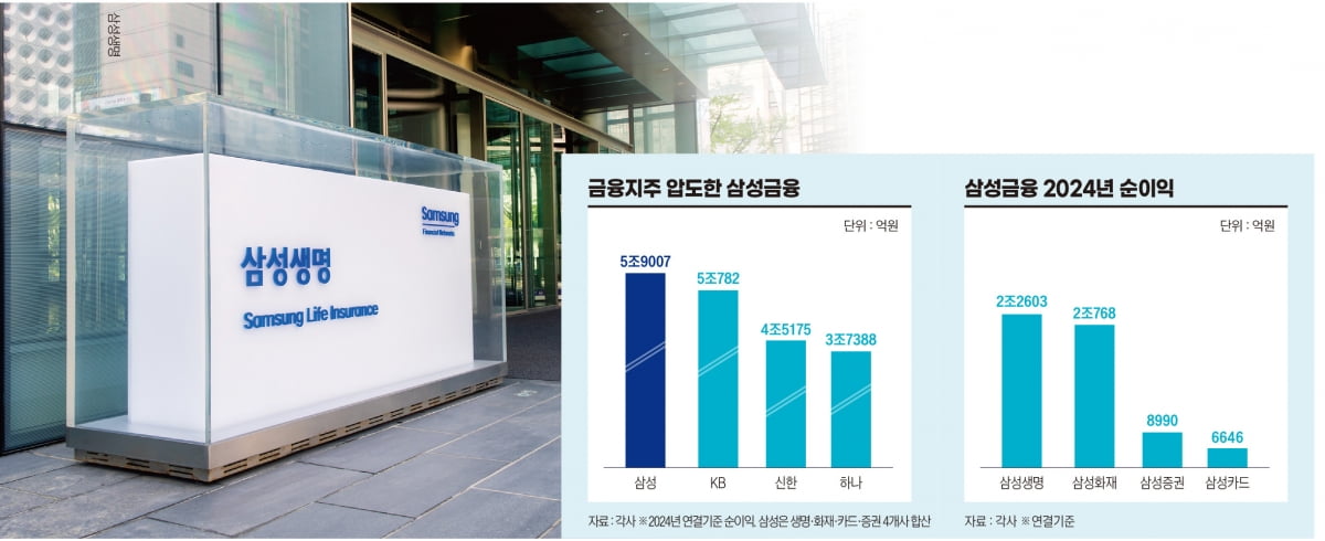 삼성금융 4개사의 실적은 5대 금융지주를 모두 앞섰다. 금융그룹 1위인 KB금융지주(순이익 5조782억원)를 가뿐히 넘어섰다. 2023년에 이어 2년 연속이다. 신한금융지주(4조5175억원), 하나금융지주(3조7388억원), 우리금융지주(3조860억원), NH농협금융지주(2조4537억원)와의 격차는 많게는 3조5000억원 가까이 벌어졌다.