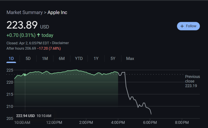 도널드 트럼프 미국 대통령이 전세계 국가에 상호관세를 부과하면서 미국 주식이 시간외 거래에서 폭락하고 있다. 특히 애플과 같이 중국과 인도에서 제품을 생산하는 기업들이 큰 타격을 받고 있다.